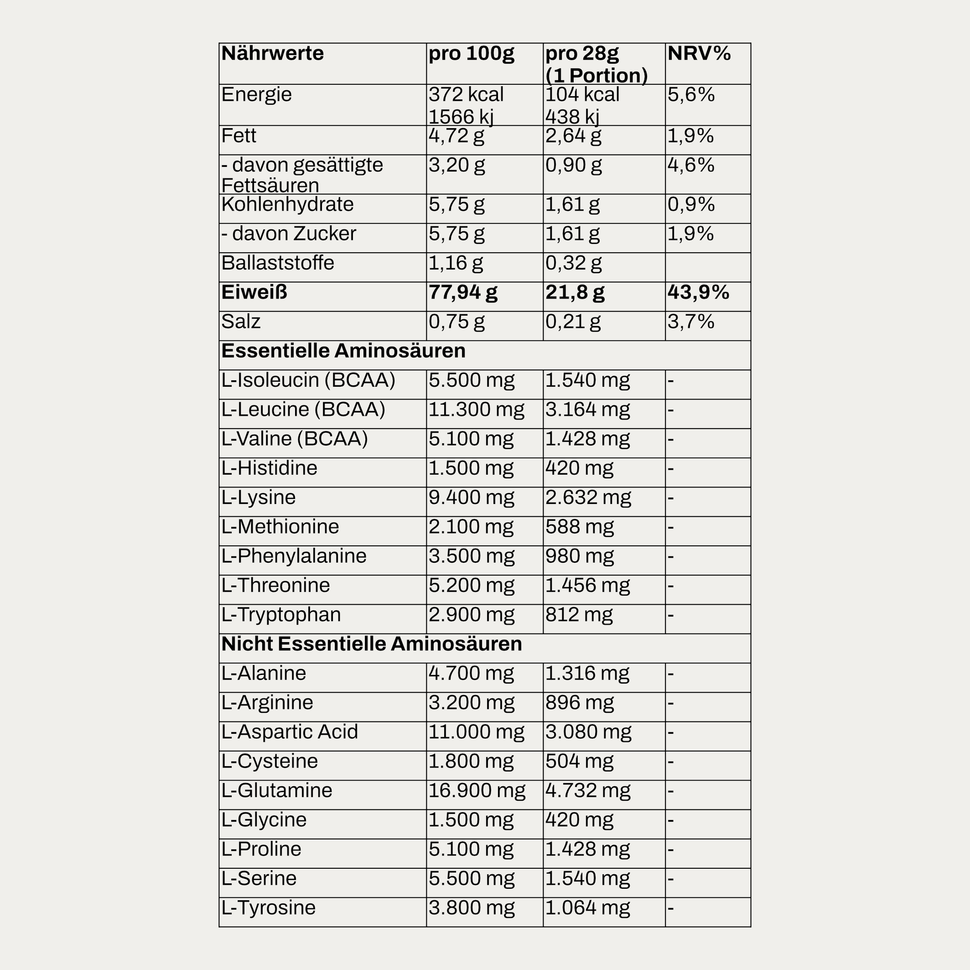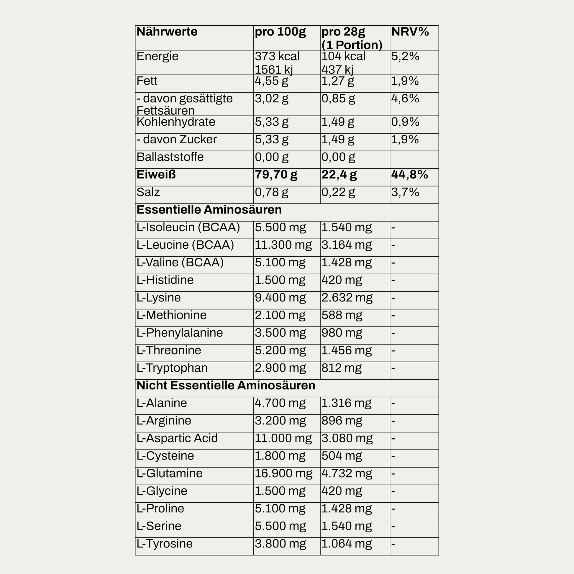 Unser Whey-Protein ist die ideale Wahl für alle, die Milchprodukte gut vertragen – es enthält alle 9 essenziellen Aminosäuren und liefert wertvolle Mikronährstoffe wie Kalzium.